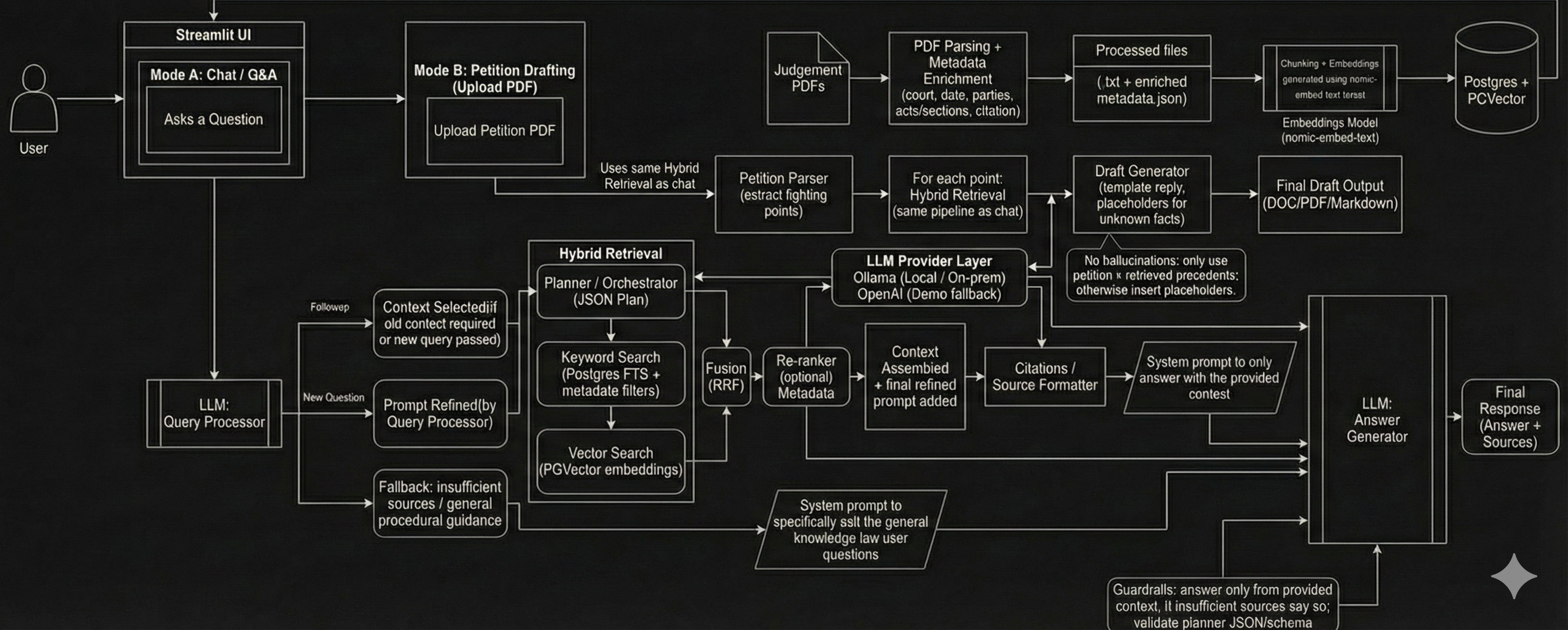 - Filtration: Before the AI answers, a "Filtration Agent" reads the retrieved documents. It acts like a senior lawyer, throwing out irrelevant cases and deciding if we need to load the full text of a judgment or just its summary.