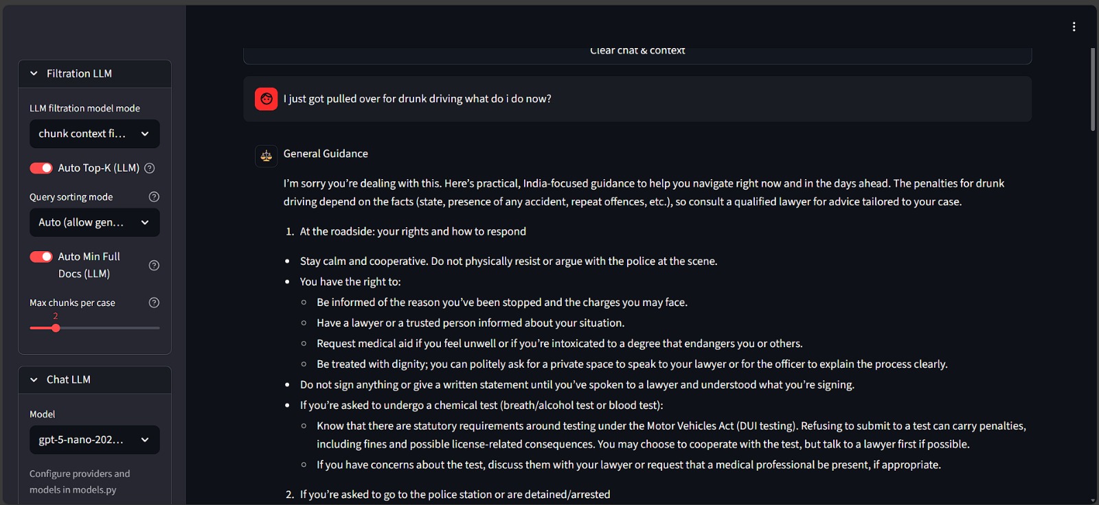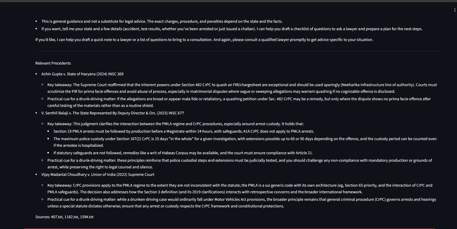 - Advisory Queries: You can ask something personal like, "I was arrested for bribing an officer, what should I do?" The system retrieves relevant legal provisions (like the PC Act) and gives procedural advice.