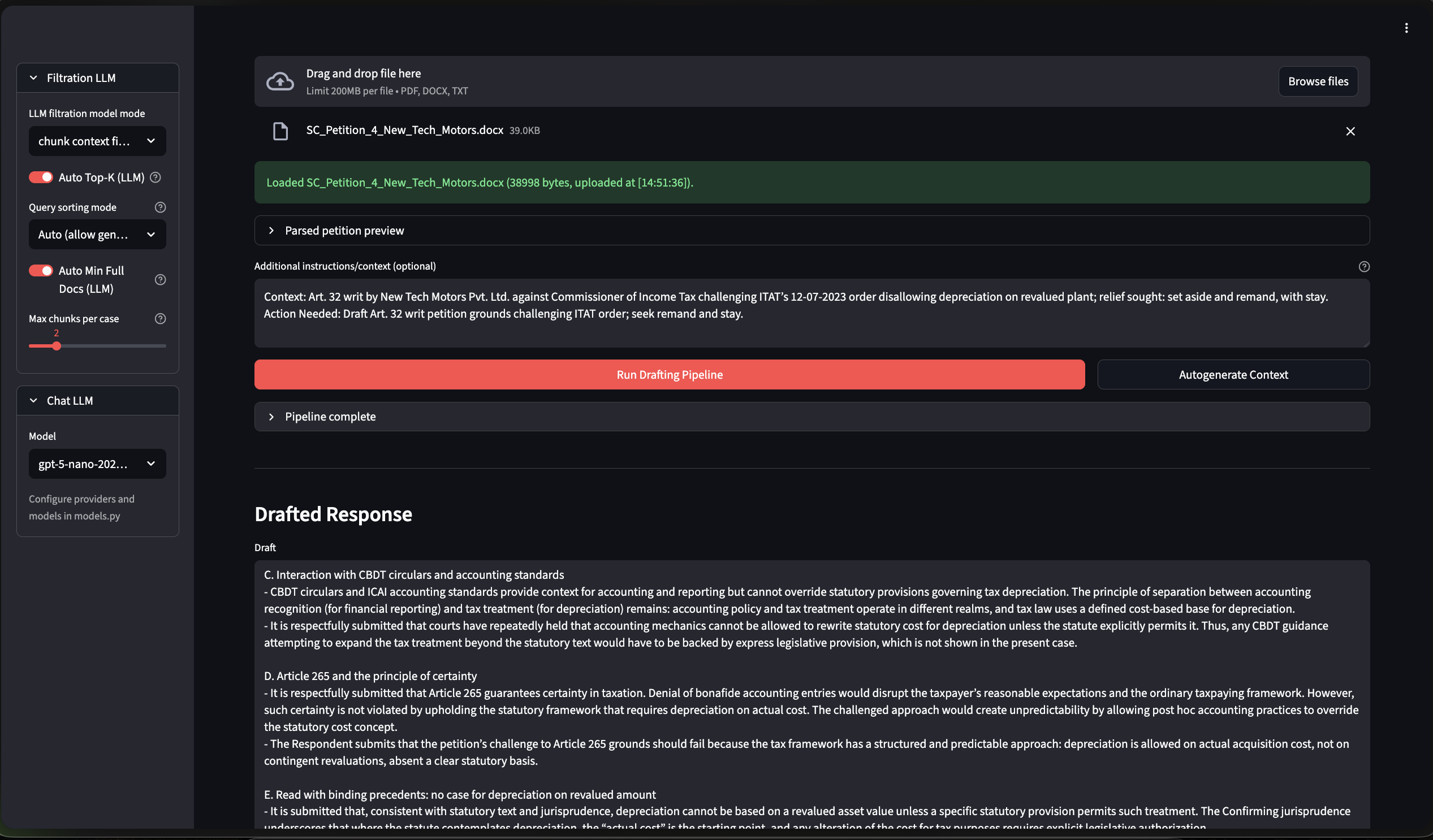 It then searches the database for precedents that favor the respondent and drafts a formal legal reply, complete with placeholders for facts it doesn't know. It's designed to never invent details, only using what is in the database or the uploaded file.